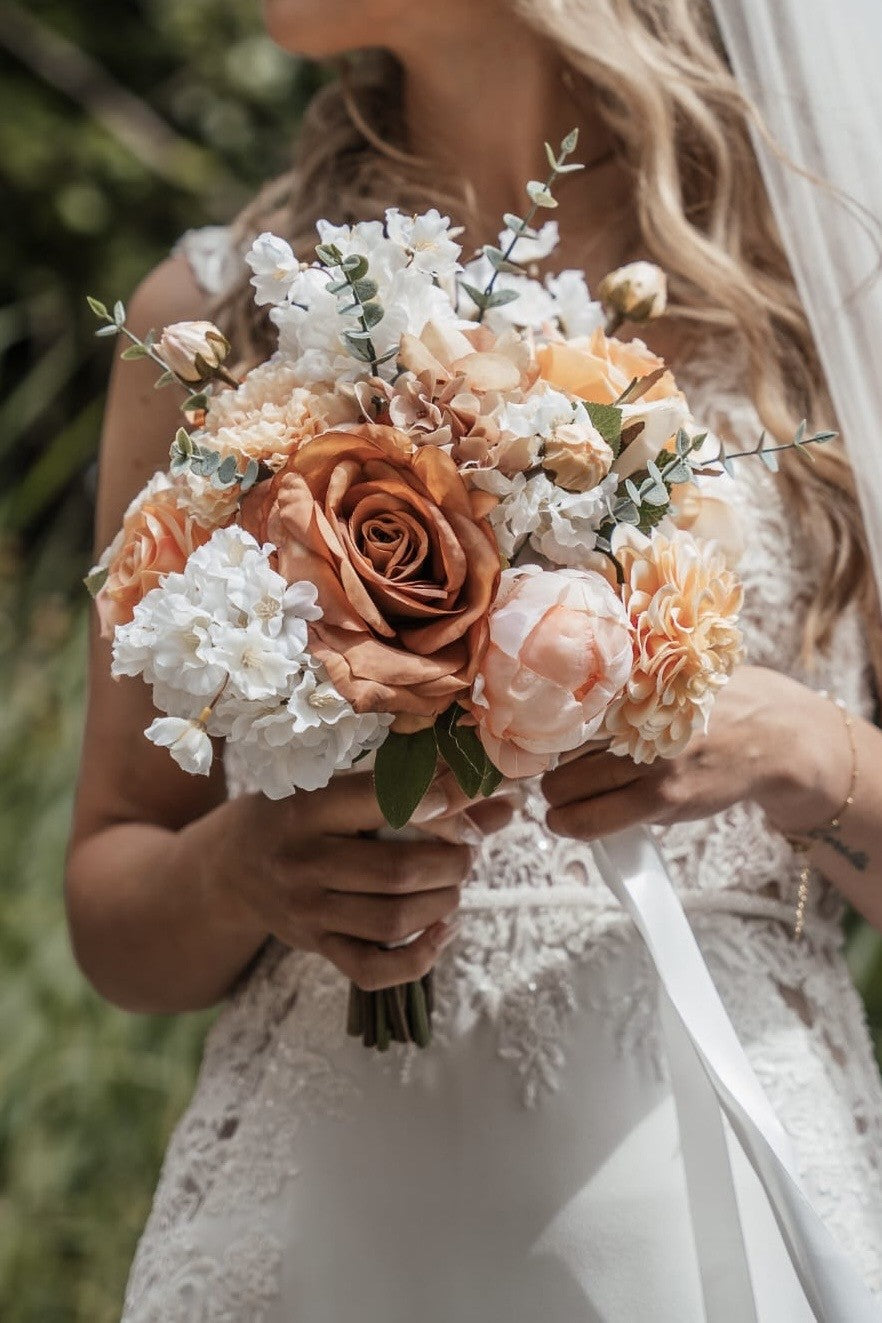 Biedermeier boeket in rustige, warme peach- en bruintinten met fris wit en een klein takje eucalyptus er doorheen.